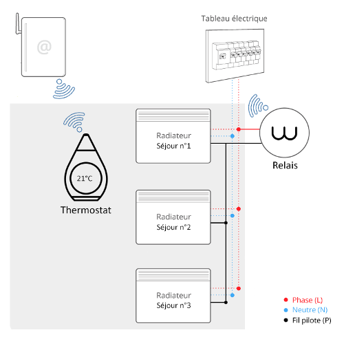 Il va falloir en premier temps raccorder un relais sur les fils pilote des radiateurs. Vous pourrez ensuite installer le thermostat et le connecter à votre box internet via le relais.